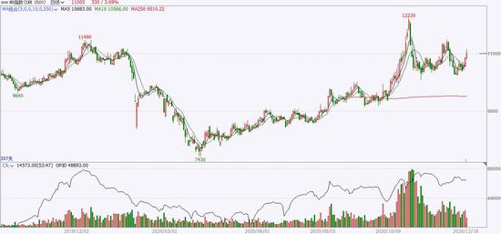 20号胶期货2020年走势与沪胶基本趋同,二季度初创出了自去年8月上市以来的最低点7430(文华NR指数4月2日),之后逐步企稳回升,经历了5-7月的整理期,8月开始启动走高,经过9月及10月的大涨期,期价冲高至12230点(文华橡胶指数10月28日),年内最大涨幅达到64.6%,11月以来基本维持高位运行态势,核心运行中枢维持在文华NR指数10000-11500之间。