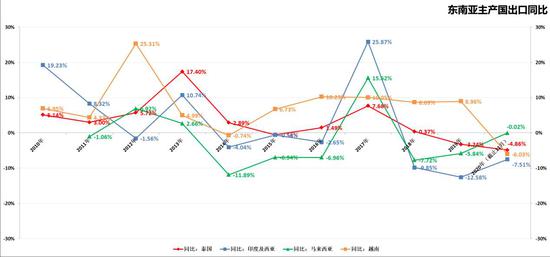 主产国方面来看,出口降幅都较为明显,泰国前11月出口341万吨,同比降幅4.86%;印尼前11月出口221万吨,同比降幅7.51%;马来西亚前11月出口96万吨,同比降幅0.02%,与去年几乎持平,主产国中降幅最小;越南前11月出口137万吨,同比降幅6.03%。