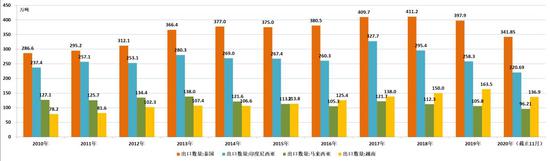 ANRPC主要成员国合计出口量在2017年和2018年连续两年突破1000万吨大关,2017年出口1036万吨,2018年出口1007万吨,2019年再次回归千万吨以内,出口971万吨,同比下降3.6%,2020年继续弱势,前11个月累计出口仅达845万吨,考虑到2020年单月合计出口数量最高仅达到84万吨(7月)的水平,2020年累计出口或将仅仅达到925万吨附近,同比降幅扩大至4.7%左右。
