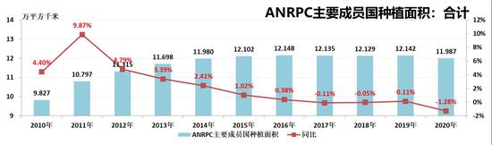 种植面积方面,2015年以来,ANRPC国家种植面积维持多年的增长状态进入停滞阶段,除了2015年依然能够维持1%左右的扩展之外,2016年几乎持平,2017年和2018年甚至出现微幅萎缩,2019年也仅仅维持0.11%的微幅增加,而2020年再次回归种植面积萎缩态势,相比2019年下降1.28%,降幅为近10年最大,但总体上天胶种植面积呈现稳定态势,基本稳定在12万平方千米左右。