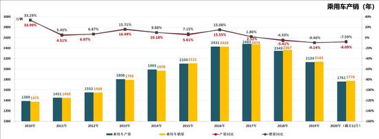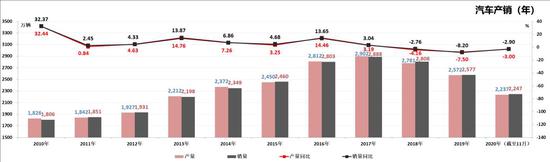 国内汽车产销自2017年筑顶回落以来,在车业大周期回落又有疫情扰动背景下,基本确定要经历连续第三年的产销下滑,但2020年态势却也没有那么惨淡,因为自二季度开始,国内车业出现了惊喜的触底回升意味,在乘用车和商用车双驱动回升带动下,国内汽车产销同比大幅扭转了一季度的惨淡表现,截至11月,已将汽车产销累计同比跌幅由40%的水平拉回到3%附近,令市场惊喜。数据显示,自2017年汽车产销创纪录地达到2902万辆和2888万辆之后,从2018年开始汽车产销开始下滑,2019年产销达到2572万辆和2577万辆,同比跌幅分别达到7.5%和8.2%,在市场预期行业继续大幅下滑背景下,2020年前11月,国内汽车产销分别达到2237万辆和2247万辆,同比跌幅分别仅有3%和2.9%,车业是否已经在需求好转以及供给侧改革成果显现背景下触底企稳,2021年值得期待。
