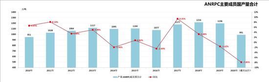 产量方面,2019年,ANRPC国家总体天胶产量达到1196万吨,相比2018年1216万吨的历史高点,同比下降1.62%,2020年天胶产量继续弱势发展,截至11月,ANRPC主要成员国天胶产量同比降幅已经达到7.85%,全年大幅减产已成定局,由于12月是产胶国总体减产期前期,预计全年降幅或将达到8%。