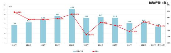 轮胎产量方面,随着近年轮胎行业供给侧改革,产能优化,落后产能淘汰的推进,自2014年轮胎产量达到创纪录的11.14亿条之后,国内轮胎产量基本呈现逐年下降态势,2018年产量由2017年的9.26亿条降至8.16亿条,但2019年出现小幅环比回升,来到8.42亿条,但2020年的情况由于受到疫情、中美贸易摩擦等严重负面因素影响,产量回落基本难以避免,2020年前11月累计轮胎产量达到7.44亿条,同比去年下降3.13%,考虑到12月有所回落的开工状况,预计2020年轮胎产量或在8.1亿条附近,降幅在4%左右。