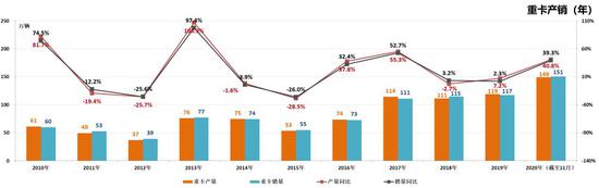 商用车中的经济风向标重卡方面,2020年表现更是疯狂,前11个月重卡产销分别达到149万辆和151万辆,同比分别实现40.8%和39.3%的增长,即使对比2019年全年产销,增幅也分别达到25.2%和29%,已经确定连续三年产销维持在110万辆大关以上,重卡表现稳定一方面显示了宏观经济的复苏态势,也给汽车产销总体下滑背景下的天胶价格走向注入了信心。