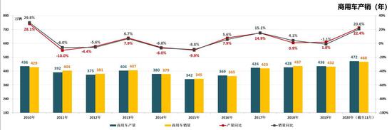 商用车方面,作为车业总体进入寒冬背景下支撑车业的支柱与旗帜,其近年来表现愈发趋强,不仅没有出现大幅下滑,反而屡屡令市场欣喜,2020年更是登封造极,仅仅前11个月的累计产销相比过去全年产销就已经创下了历史性新高,数据显示,2020年商用车表现强劲,尤其产量已经确定将保持第五年的连续增长,仅仅前11个月产销就分别达到472万辆和468万辆,提前达到过去三年的全年水准,并且已经创出历史性产销新高。