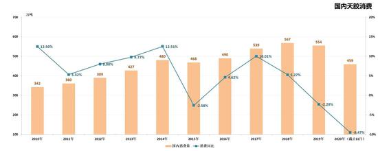 2019年是自ANRPC统计成员国天胶消费以来,国内天胶消费除了2015年之外,第二个出现同比下降的年份,2019年国内天胶消费没有继续连年创高,而是出现小幅同比回落,但依然达到554万吨,同比2018年的567万吨,下降2.3%,2020年前11个月国内累计天胶消费459万吨,相比2019年同期的507万吨,降幅9.5%,降幅偏大,预计2020年总体消费或将勉强达到500万吨水平,降幅10%左右。