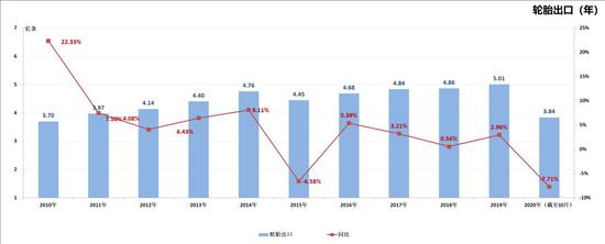 轮胎出口方面,虽然轮胎产量在2014年以后下降明显,但是轮胎出口并没有明显下降,实际上,自2015年以来轮胎出口是连年递增的,2017年和2018年均超过了2014年的阶段性高点来到4.8亿条以上,2019年创纪录地达到5.01亿条,首次突破5亿条大关,但2020年出口环比下降或以不可避免,2020年前10个月国内轮胎出口累计达到3.84亿条,同比去年同期的4.16亿条已经下降7.71%,考虑到11月及12月是季节性轮胎高出口月份,参考10月出口4612万条的数据,保守估计月度出口达4500万条问题不大,2020年全年轮胎产量预计将达4.75亿条左右,降幅预计在5%左右。