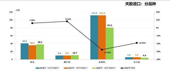 分品种来看,2020年3月至10月除了乳胶和烟片小幅同比增加,主要的标胶品种以及复合胶品种都呈现明显下降。其中,3月至10月累计进口标准胶81万吨,相比去年同时间段的111.9万吨,大幅下降27.63%;累计进口胶乳38.2万吨,同比去年同时间段的36万吨,小幅增加5.98%;累计进口烟片10.7万吨,同比去年同时间段的9.9万吨,小幅增加8.24%;进口复合胶4.4万吨,同比去年同时间段的5.5万吨,降幅达19.05%。