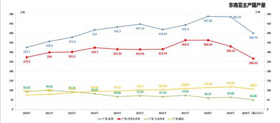 东南亚主产国方面,各国减产已成必然,而且泰国、印尼减产幅度将较大,统计数据显示,2020年泰国前11个月累计产量只有399万吨,近几年来首次未破400万吨大关,同比去年的425万吨下降6.08%;印尼方面情况也不乐观,前11个月累计产量达到266万吨,相比去年同期的304万吨差距较大,大幅下降12.32%;马来西亚方面,经过了2019年产量的小幅回升,2020年恐将再次进入下跌节奏,前11个月累计产量达到50万吨,同比去年的58万吨,大幅下降13.88%;越南方面,情况相对稳定,前11月累计产量达到106.5万吨,相比去年同期的108.7万吨小幅下降2.02%。