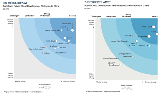 另外,在研究机构Forrester发布的2020年报告中,华为云凭借领先的技术实力与产品性能、前瞻性的战略、完善的生态体系,站在中国公有云开发平台领导者行列,并在战略维度(如下右图横坐标)排名首位,比2018年大幅上升。