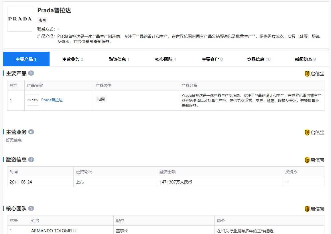 启信宝数据显示,意大利品牌Prada于1913年在米兰创建。Miuccia Prada的独特天赋在于对新创意的不懈追求,融合了对知识的好奇心和文化兴趣,从而开辟了先驱之路。