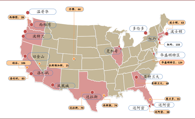 资料来源:Google,TelX,中金公司研究部。注:以上数据截至2020年9月30日,粉色区域代表数据中心较为密集区域,虚线框代表美国主电信机房分布,橙色框代表美国数据中心分布。以华盛顿特区图例为例,橙色框表示华盛顿地区拥有数据中心有124个。