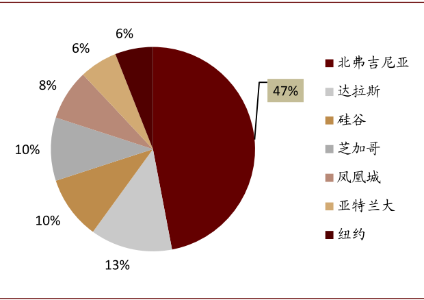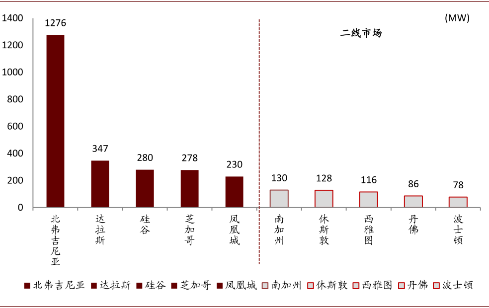 图表: 截至2020年上半年,美国主要地区批发型数据中心电力库存量