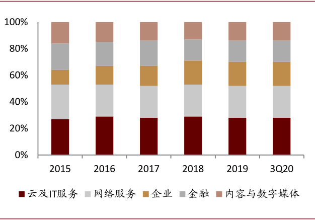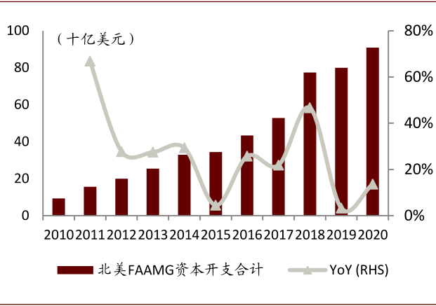 随着业务发展成熟,IT规模扩张到一定体量,美国互联网巨头开始加码数据中心自建。2019年,亚马逊投资上亿美元用于北弗吉尼亚地区数据中心扩建,2020年旗下子公司Amazon Data 投资了7,300万美元购买弗吉尼亚土地。谷歌早在2006年就参与自建数据中心,2020年对未来数据中心建设的资本开支计划达百亿美元。