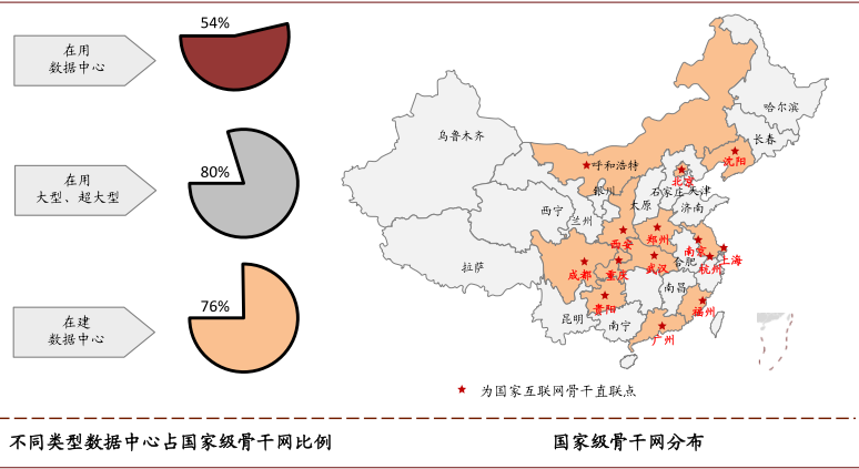 ► 数据中心初期随网而建,随后逐步主动加强网络布局。数据中心早期建设“就地取材”,选择毗邻主电信机房及骨干网络节点建址。随着数据量的爆发,用户需求分布不断分散,用户区位分布也逐渐向外扩张,加之用户对时延性要求的日益提升,自建网络成为扩大覆盖缓解时延的重要方式。由于目前中国自建网络受监管牌照限制,缩短传输距离及优化网络架构是当前主要手段。