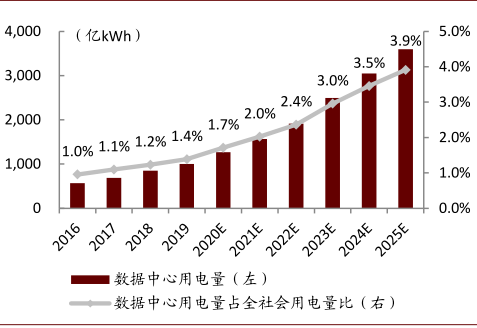 数据中心本质是将电力高效转换为算力的基础设施,作为电力能耗大户,根据美国能源信息局,2019年美国数据中心耗电约790亿千瓦时,占全美全年电力消耗2%左右。根据我们测算,2020年美国数据中心整体耗电约1140亿千瓦时,占全美电力消耗约2.9%。