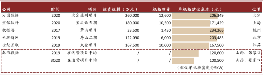 4) 云计算厂商的业务目标放在更软件化的云业务中,在成本下沉方面不具有优势,以租用数据中心的方式将硬件设施运营交付给专业第三方将享有更低的成本。我们简单测算云厂商自建数据中心的成本:一线城市,单标准5kw机柜固定资产投入约为15万元,每年固定资产折旧+租房+机柜+带宽+电费+人工的硬性成本已超过7万元,加上可变成本以及突发事件处理成本,自建单机柜的成本并不占明显优势。从行业平均水平看,一线城市数据中心标准5kw机柜年租金约为7-10万元;秦淮数据通过前店后厂模式,经过我们测算,单标准机柜年租金约为5-6万元。
