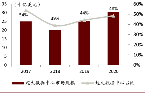 IDC并购交易数量增多,未来向超大规模数据中心发展。随着行业不断发展,小型IDC逐渐被大型IDC公司兼并,超大规模数据中心(按照美国标准:单数据中心服务器超过5000架为超大规模数据中心;按照中国标准:数据中心标准机架数量超过或等于10000架为超大规模数据中心)成为未来的发展趋势。