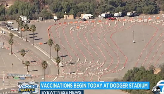 图/加州开放道奇体育馆做为疫苗接种点。因目前仅为医护人员接种疫苗,体育馆内显得较为空旷。