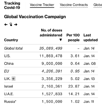 图:世界各国新冠疫苗接种进展(来源: Bloomberg)