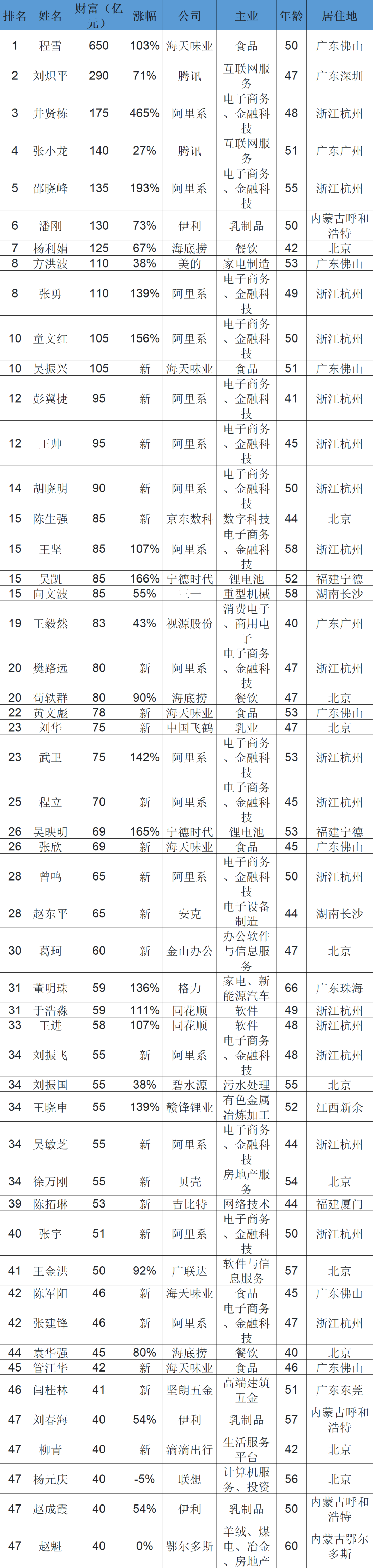 联想集团董事长56岁的杨元庆、滴滴出行总裁42岁的柳青都以40亿元财富位列第47名。