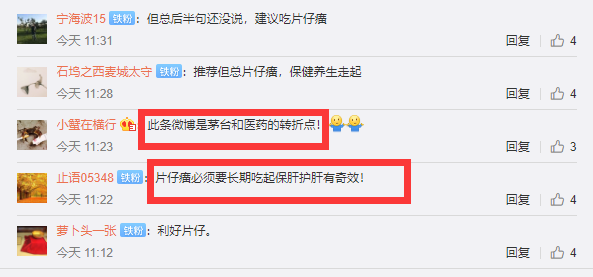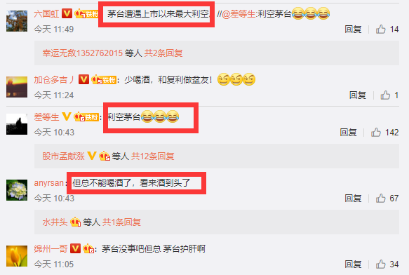 于是,网友们纷纷在其微博底下留言调侃,“利空茅台”、“利空白酒”、还有网友开玩笑称:“但总,喝酒前要先来一个片仔癀保肝!”。另有网友宣称,“此条微博是茅台和医药的转折点!”。更有网友戏称:“茅台遭遇上市以来最大利空!”