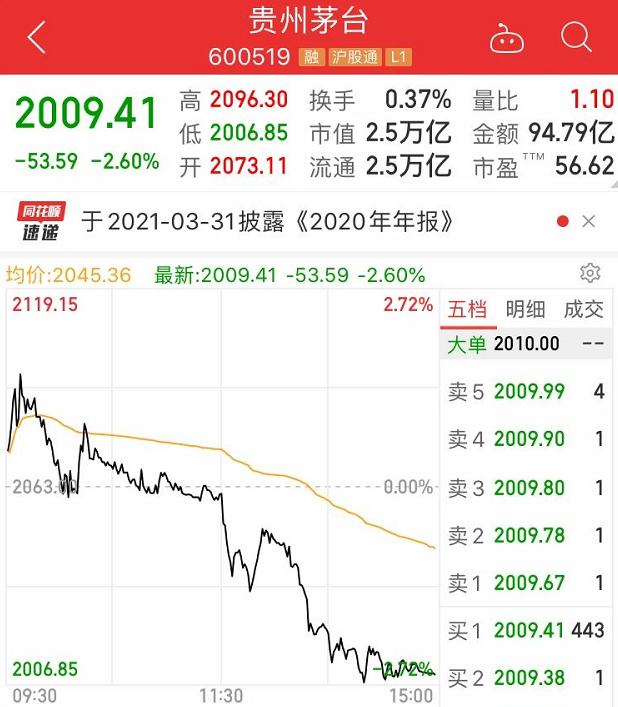 今日午后,贵州茅台股价出现调整,截至收盘跌2.6%,全天振幅超4%,成交额达94.8亿元,单日市值蒸发670亿元。