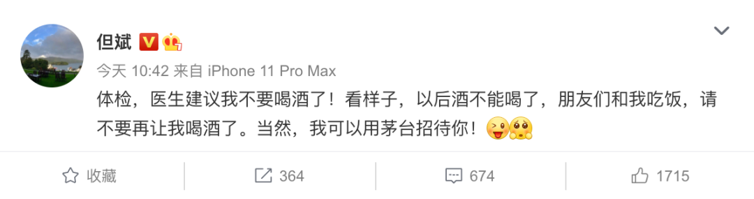 1月19日上午10时42分,但斌发布微博称:“体检,医生建议我不要喝酒了!看样子,以后酒不能喝了,朋友们和我吃饭,请不要再让我喝酒了。当然,我可以用茅台招待你!”