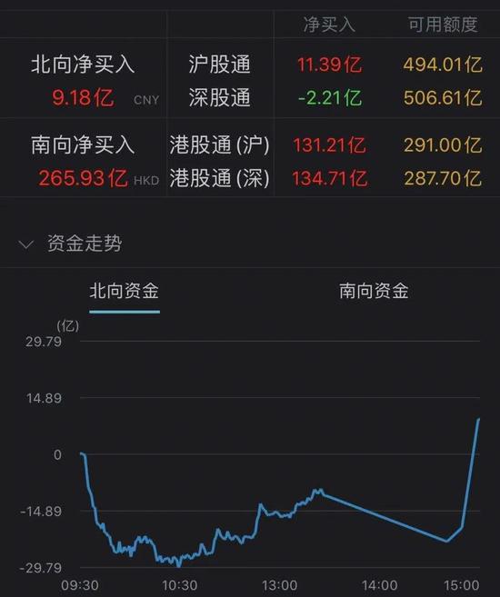 从资金面情况来看,Wind数据显示,今日北向资金净流入9.18亿元,其中沪股通资金净流入11.39亿元,深股通资金净流出2.21亿元。在抱团股集体下跌的情况下,尾盘北向资金却出现直线流入。