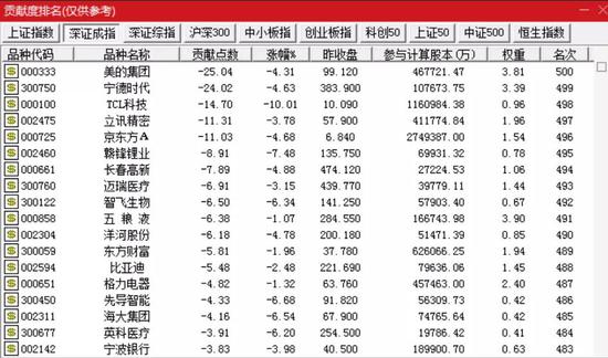 对深证成指拖累居前的个股分别为美的集团、宁德时代、TCL科技、立讯精密、京东方A、赣锋锂业、长春高新等。