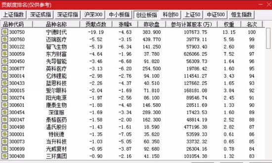对创业板指拖累居前的个股分别为宁德时代、迈瑞医疗、智飞生物、东方财富、先导智能、英科医疗等。