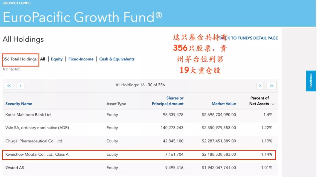1月19日,中证君从美国资管巨头资本集团官网获悉,截至2020年底,资本集团旗下的美洲基金-欧洲亚太成长基金(American Funds——Europacific Growth Fund)持有贵州茅台7161704股,较三季度末的7611804股,减少5.9%。这只基金是目前全球持有贵州茅台股份数最多的基金。截至2020年底,这只基金持有贵州茅台市值为21.89亿美元,折合人民币141.95亿元。