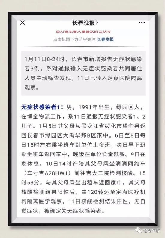 愉观车市了解到,该确诊人员即长春晚报1月11日8-24小时测试中查到的无症状患者,1991年出生的男性,在博金物流工作。相关行程长春晚报也作了详细报道。
