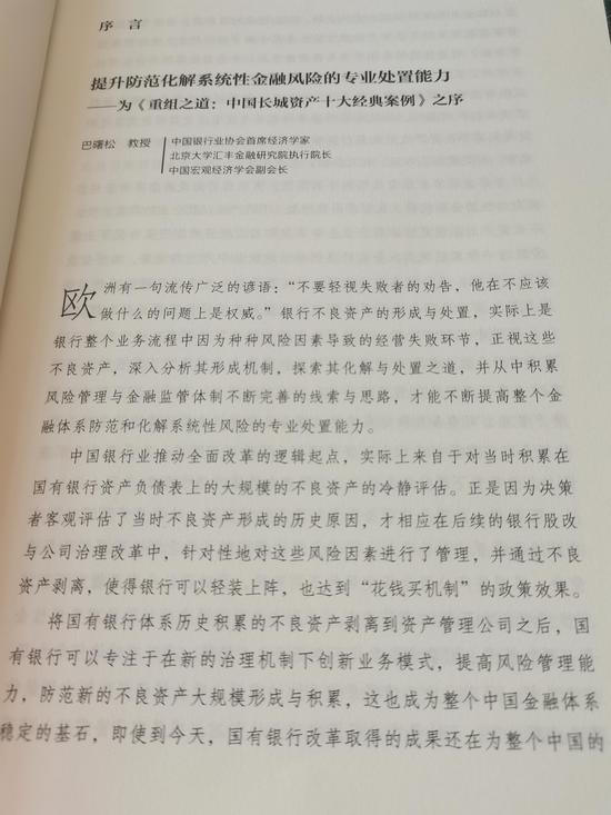 中国银行业协会首席经济学家、北京大学汇丰金融研究院执行院长、中国宏观经济学会副会长巴曙松教授为此书做序,巴曙松教授提到:在中国金融市场上,要有效处置不良资产,寻求系统性金融风险的防范化解路径,需要放眼全局的视野和大格局,运用重组的思维,对存量不良资产进行有效的盘活,进而实现社会资源的优化配置。这是一项综合性的、专业难度高,而且在有的环节还带有艺术性的高难度专业工作。它既无标准模板可依,也无固定的套路可循,而且情况复杂多变。要做好这项工作,除了创新,别无他法。