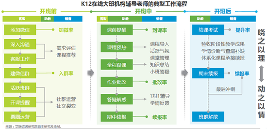以辅导老师工作内容为例,就涵盖了加微率、入群率、到课率、批改率、提升率、续报率等多个考核维度。艾瑞咨询认为,单位主讲和助教的服务范围决定班容上限,单位主讲和助教的服务能力决定班容下限。