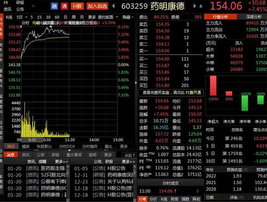 早盘,医药生物板块走强,康龙化成涨逾10%,昭衍新药涨停。药明康德涨超7%,盘中股价上触156.50元,创出历史新高,截至午间收盘,该股总市值超过3700亿元。