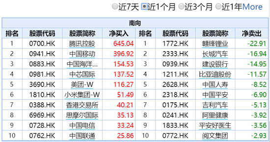 从近1个月来看,腾讯获买入超600亿,中国移动近400亿,美团、中海油、中芯国际、小米、港交所等上榜。其中,美团净流入超100亿港元。