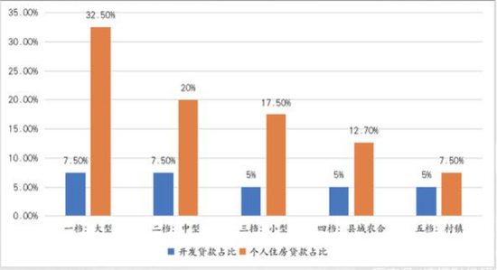 红线二:个人住房贷款占比上限最高为32.5%,最低为7.5%。大型银行不得超过32.5%,中型银行不得超过20%,小型银行不得超过17.5%,县城综合机构不得超过12.5%,乡村乡镇银行不得超过7.5%。
