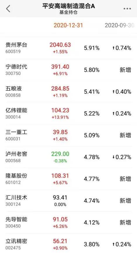 平安的基金经理李化松管理的基金规模也超过300亿元。以他管理的平安高端制造为例,去年四季度末,宁德时代、三一重工、隆基股份、汇川技术、先导智能成为基金新进前十大重仓股。