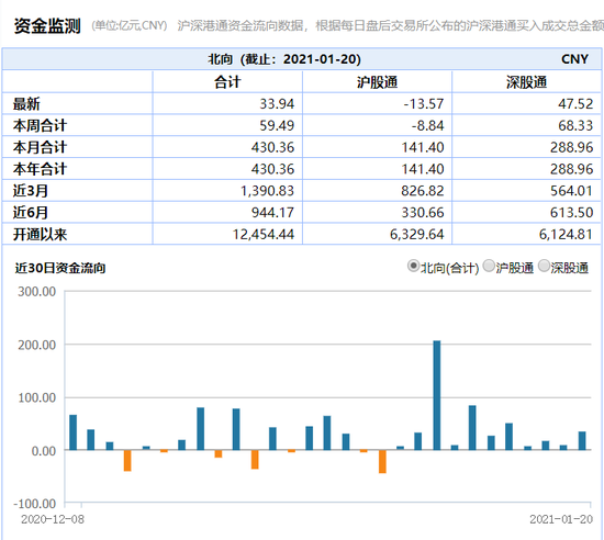 北向资金,今日净买入33.94亿元。其中,沪股通净卖出13.57亿元,深股通净买入47.52亿元。