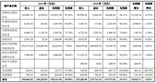 其实这也充分说明了公司并购时间互联对报表的扭曲(2018年以来公司应收账款占营收的比例大幅下降),其实公司主要产生利润品牌综合服务业务(2018年和2019年毛利率分别是94.11%和93.36%)产生了非常高比例的应收账款,但是随着时间互联的并表,公司应收账款占营收比例迅速优化至20%左右。公司品牌综合服务业务营收账款占比明细具体如下: