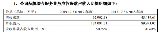 公司对其原因解释是:品牌综合服务业务应收账款占营业收入的比例为 50.69%与2018 年基本持平;主要原因是该业务模式具有明显的季节性。受电商行业“双 11”、“双 12”购物节的影响,公司品牌综合服务业务收入和回款主要集中在下半年,其中2019 年度下半年的品牌综合服务费的收入占该类收入的 71.67%,下半年回款占该类业务回款的 63.90%,因此,2019 年品牌综合服务业务应收账款占收入比例较高。