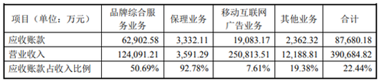 也就是说,公司的应收账款主要是品牌综合服务业务产生、其次是移动互联网广告业务,最后是保理业务。