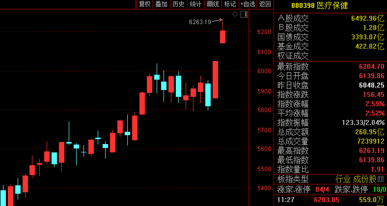 新冠检测板块早盘大涨,带动医疗保健板块指数放量高开高走,盘中一度飙升逾3%,再创历史新高。凯普生物、迪安诊断大涨超10%,金域医学、明德生物、西陇科学等涨停,迈克生物、硕世生物、华大基因、达安基因等集体上涨。
