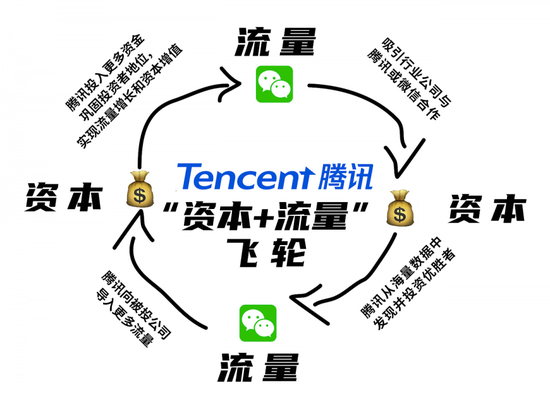 微信是今日中国最大的用户流量池,这吸引了无数行业公司与腾讯或微信合作,腾讯由此从海量数据中发现并投资优胜者,然后向被投公司导入更多流量,腾讯继而投入更多资金,巩固投资者的地位,实现流量增长和资本增值。依循“资本+流量”的逻辑,腾讯形成了飞轮效应。这套飞轮转动得越来越快,越来越好。