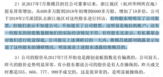 董事奚峰伟表示,熊模昌担任董事以来,浙江地区股东异常增加。公司回访时发现这些股东显然不是凭自己意愿买入公司股票的,而且股票成交时都是555、777、999手成交的。