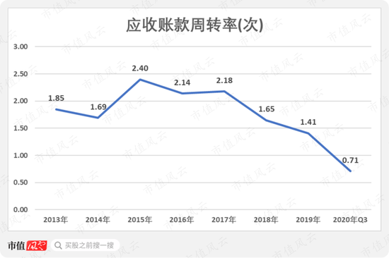 相对应的应收账款周转率在2018年快速下滑至1.65次,2019年雪上加霜,跌至1.41次,创公司有史以来最低记录。