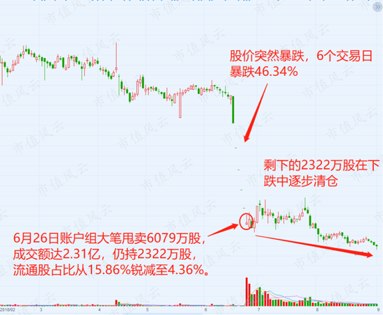 而根据决定书,在连续跌停后的6月26日,账户组大笔卖出6079.25万股,成交额达2.31亿元,仍持有2322.79万股,流通股持股占比从15.86%下跌至4.36%。