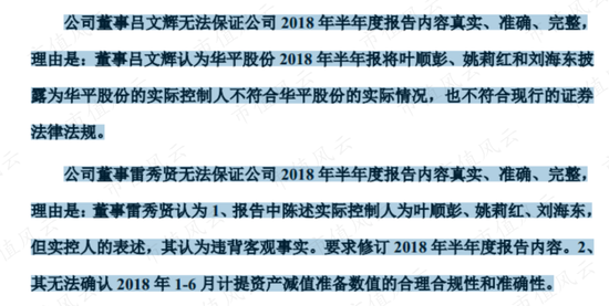 双方矛盾逐步升级,在2018年半年度报告上,智汇科技提名的董事吕文辉和雷秀贤公然表示无法保证报告内容真实、准确、完整,原因是认为将叶顺彭、姚莉红和刘海东为实控人不符合实际情况。