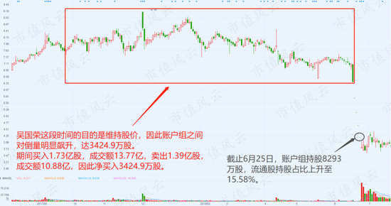 主要原因就是吴国荣控制的账户组开始建仓,通过连续交易、对倒交易等方式买入了4951.79万股,占总股本的12.51%,持仓成本约为7.08元。